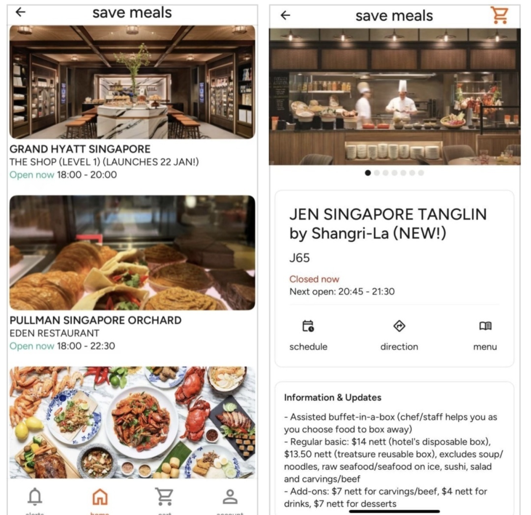 所谓剩菜盲盒,其实是新加坡星级酒店联合线上平台“款待”(treatsure),共同推出的盒装自助餐(buffet-in-a-box)服务。体验者可以从treatsure上查询酒店介绍、开放时间、食物种类等信息,然后选择线上或者酒店前台购买餐券。